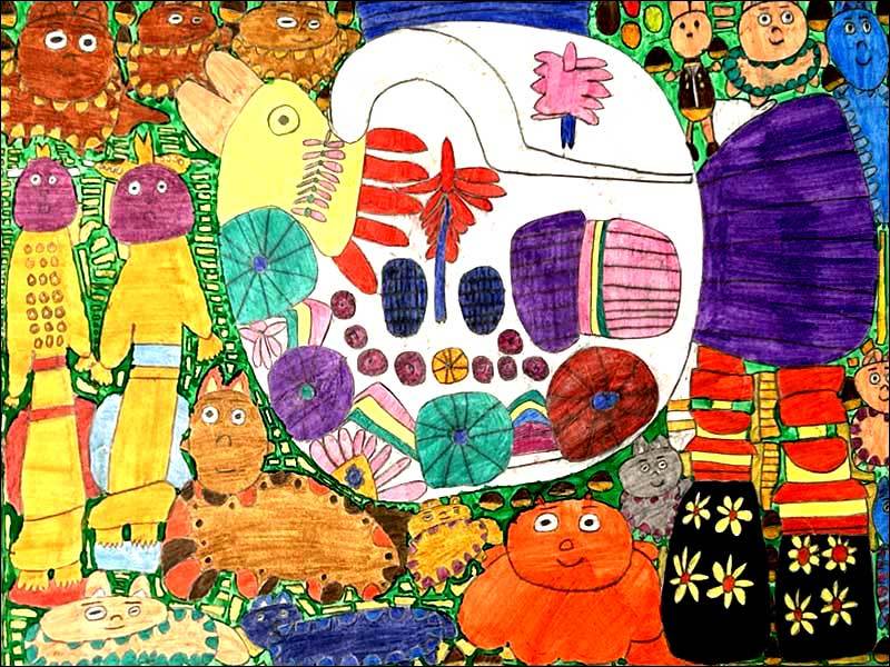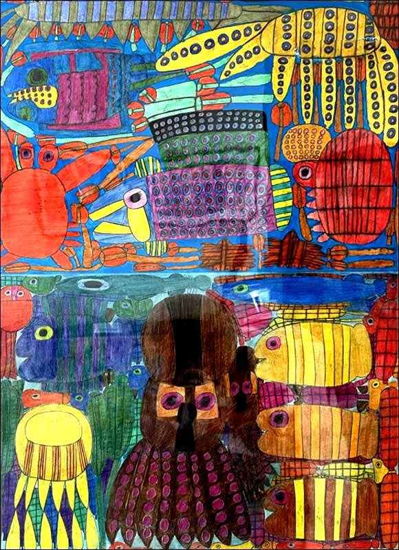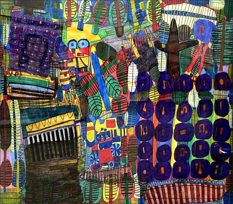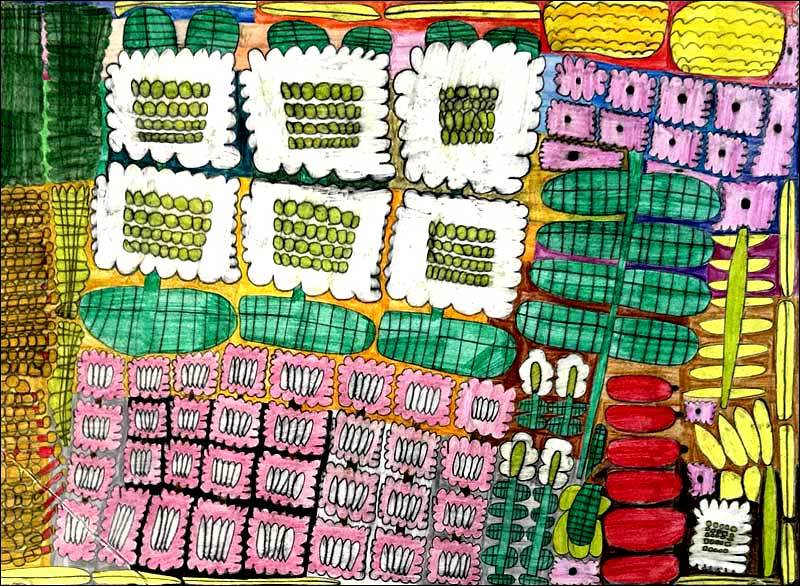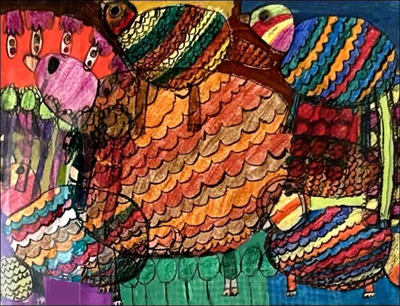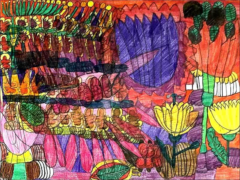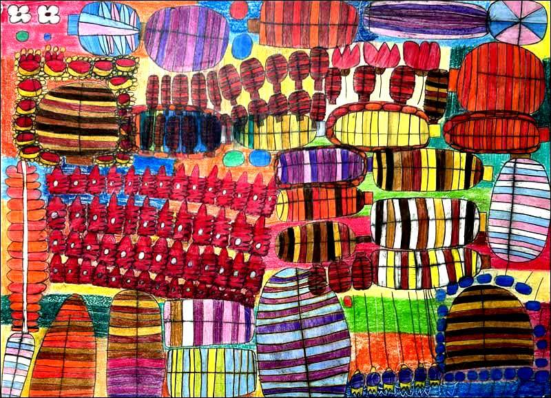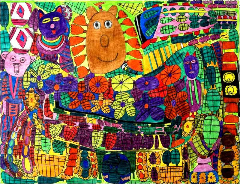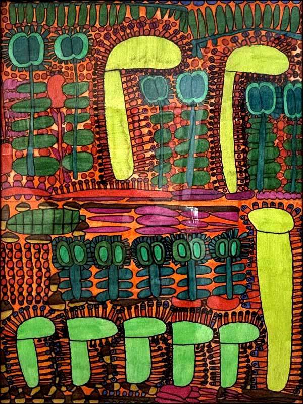 彼女の場合、どの作品にも原初的な感覚というか、わたしたち人間がまだ長い歴史をたどる前の大地から湧き上がる幾百もの色たちが祝祭を繰り広げるかのようなのです。
