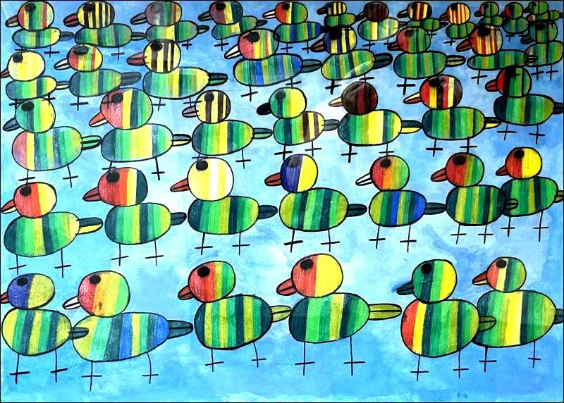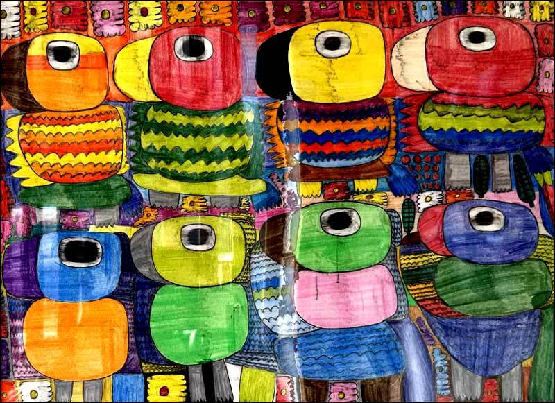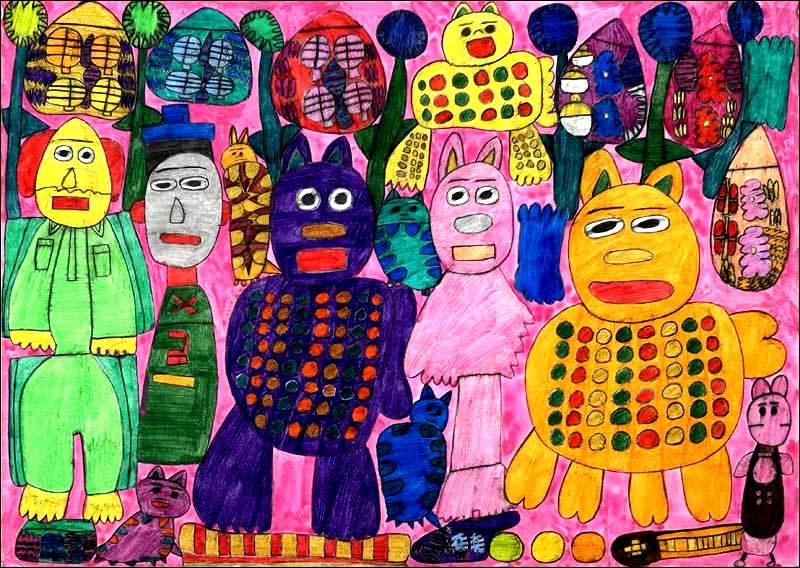 「ミントアンサンブル」のアーティストたちの絵を見ていつもびっくりし、不思議に思うのは、いったいどこからこんな想いもつかないモチーフが彼女彼らに降りてきてしまうのか。そして、これほどまでに画面の隅々まで空間を埋め尽くす情熱というか執念が宿っていることです。まるでそうしないといたたまれない何かに突き動かされるように、時には切なく切羽詰まった想いにとりつかれているかのように…。